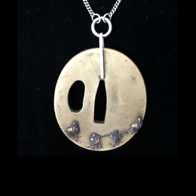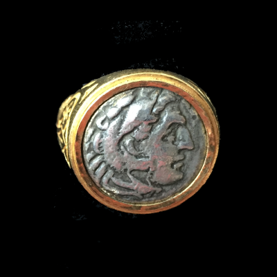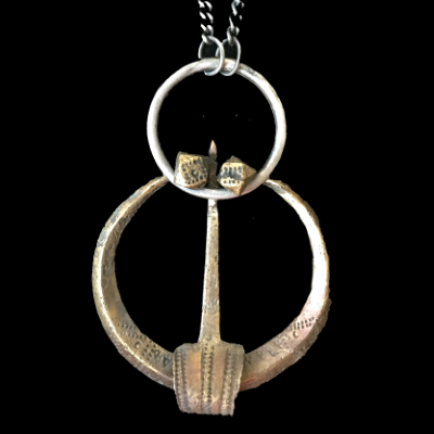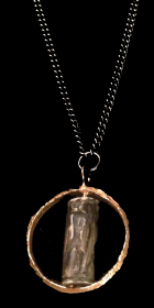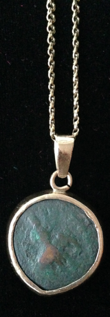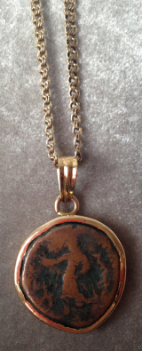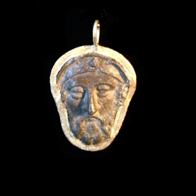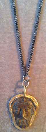 Pendentif en bronze à la tête d’Hadrien. Il représente le visage du souverain, la barbe formée de longues mèches bouclées, entouré d’or 18 carats, sur une chaîne tressée à la main, en argent noirci.