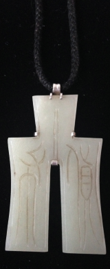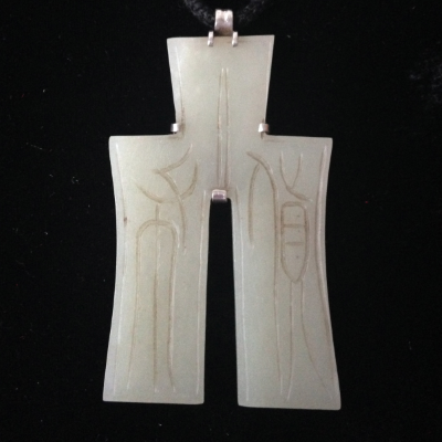 Ancienne monnaie chinoise en forme de bêche (à tête creuse) en jade représentant sur le côté droit un homme debout, côté gauche caractères indiquant son statut de moine.