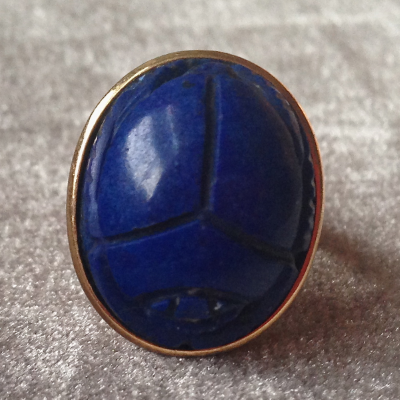 Bague en or jaune 18K ornée d’un scarabée antique en lapis lazuli, l’intérieur de la bague dessiné en motif stylisé représentant le modèle initial.