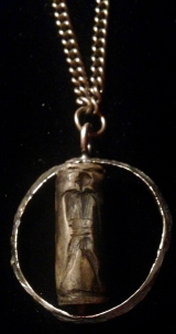 Pendentif orné d’un sceau-cylindre mésopotamien en stéatite, gravé de deux hommes debout (rendant hommage à une divinité ?) entourés d’un motif à décor de feuillage.